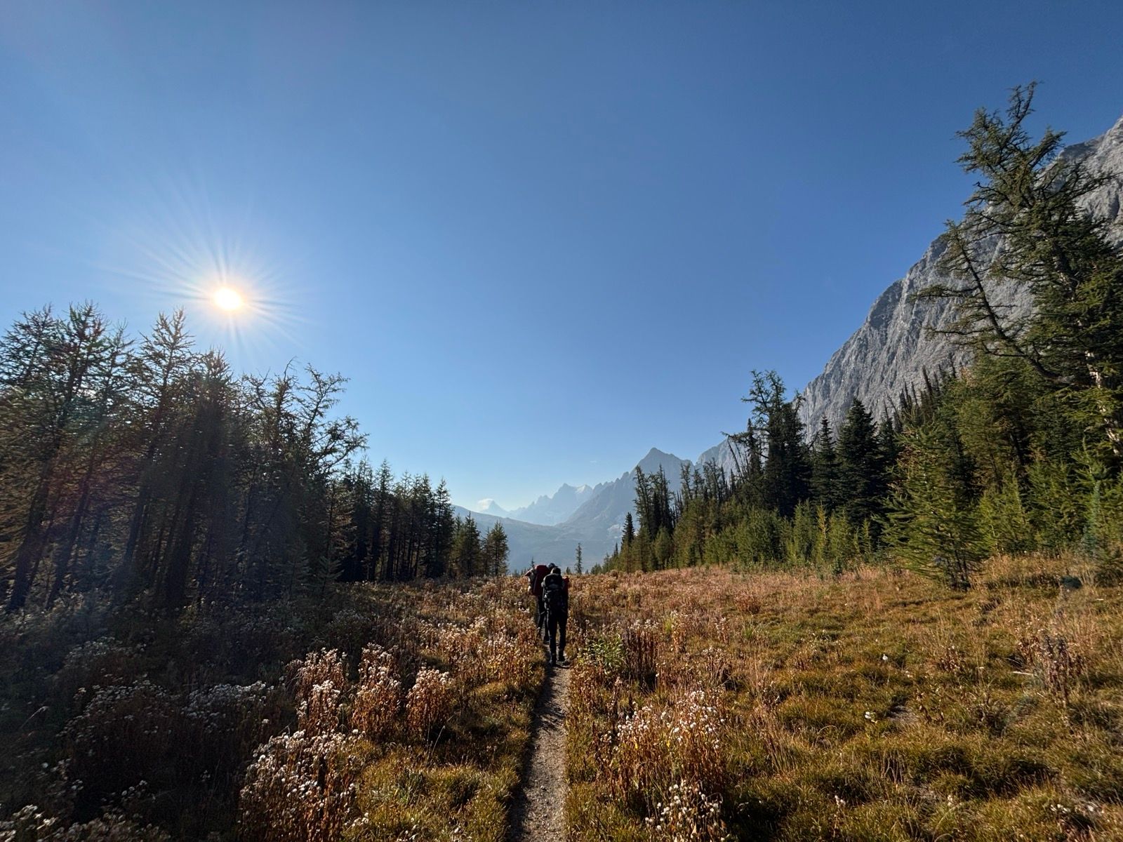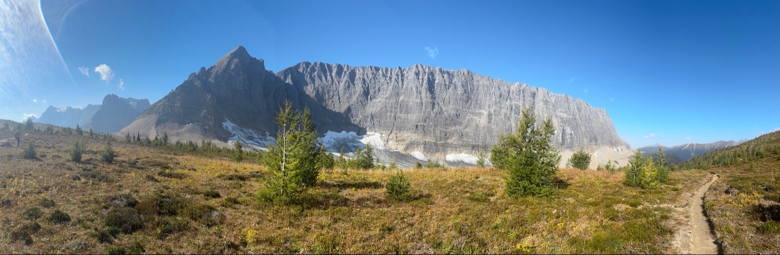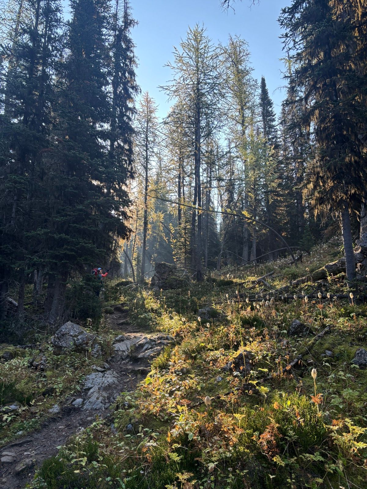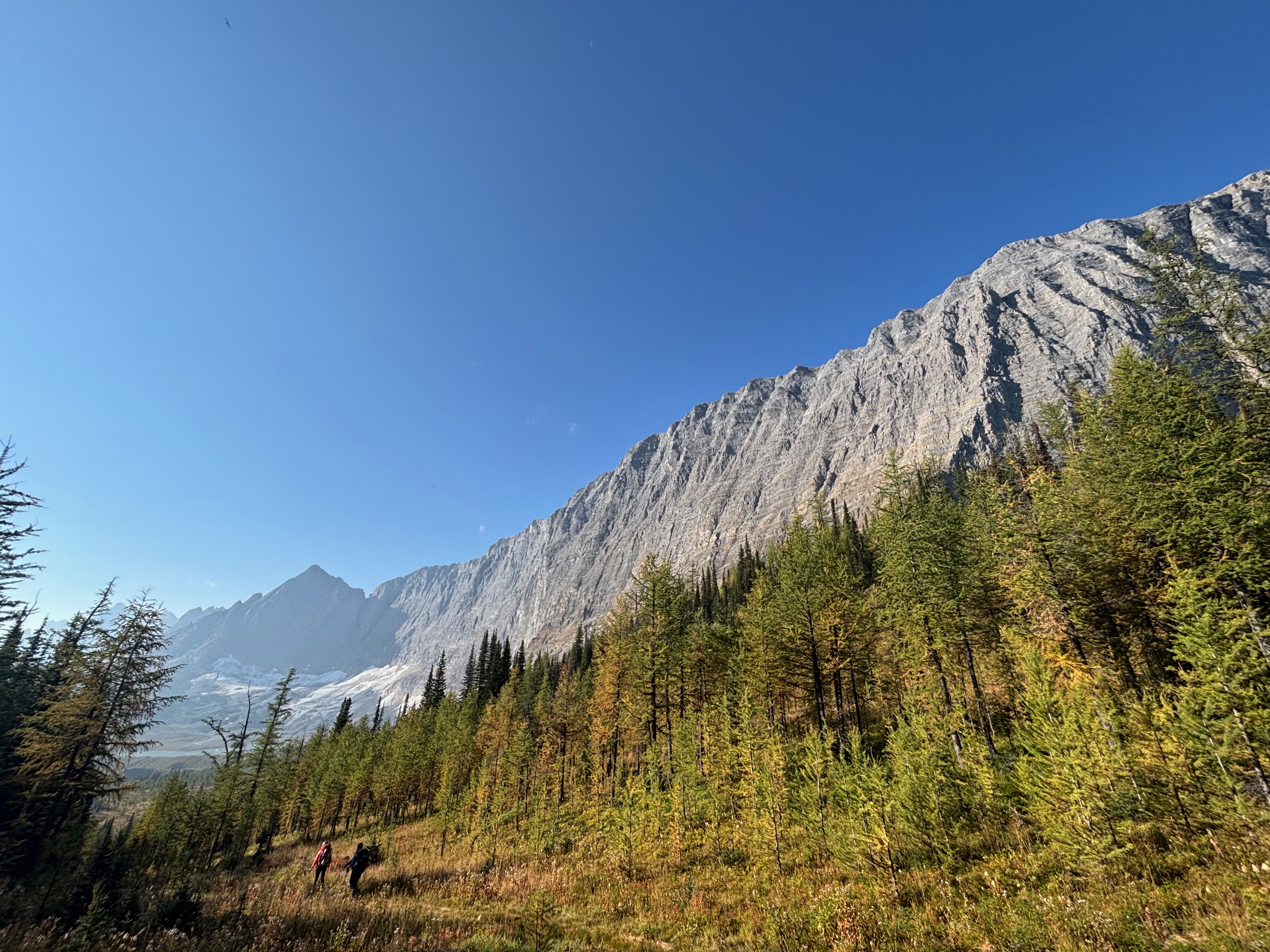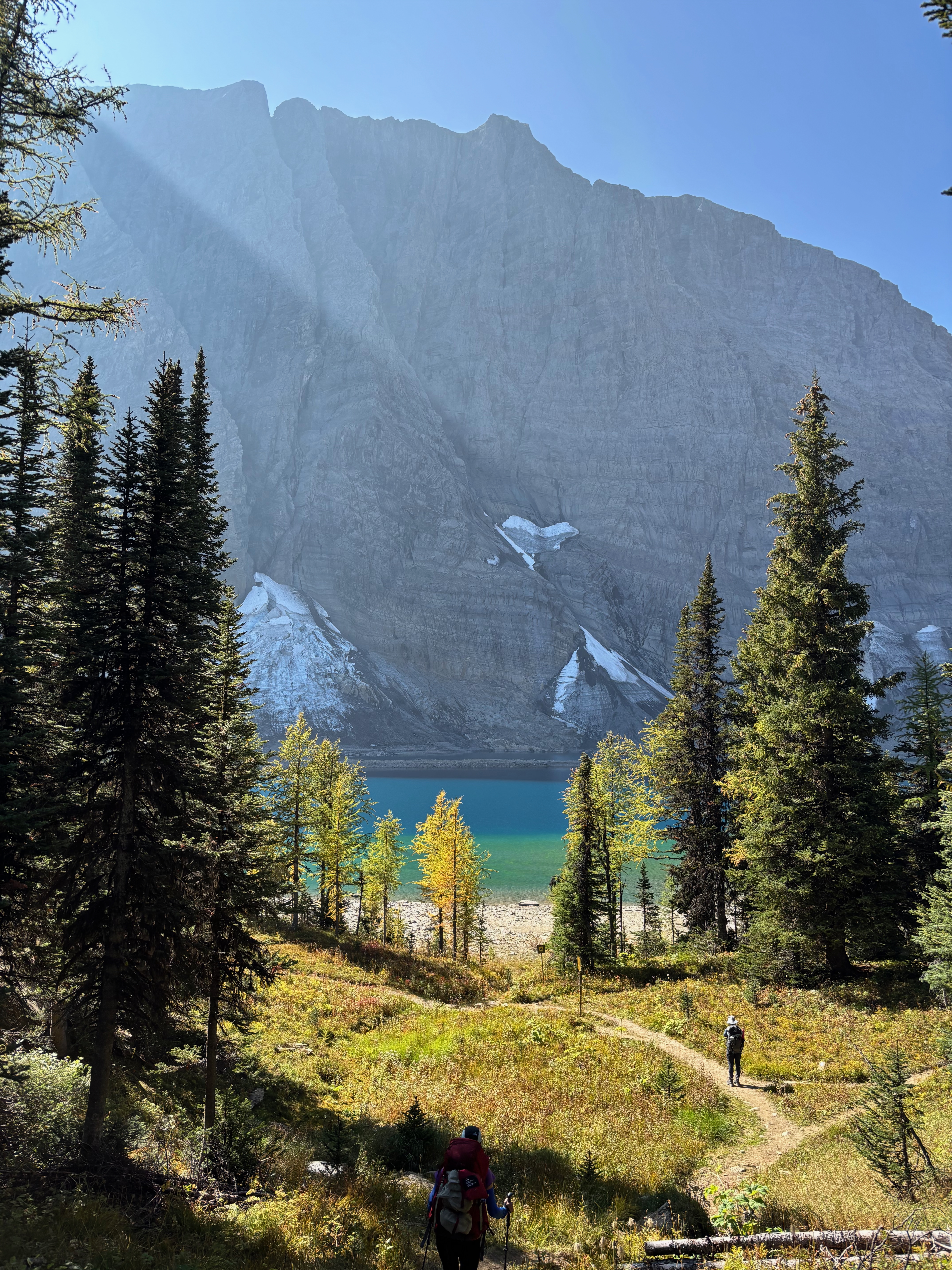 The next day we climb up away from Helmet Falls and across the west side of the Rockwall. The Rockwall is just as described, a huge wall of rock that juts out to the west, looking out over meadows, larches and lakes. Multiple times I thought of The Wall in the Game of Thrones, just nicer.