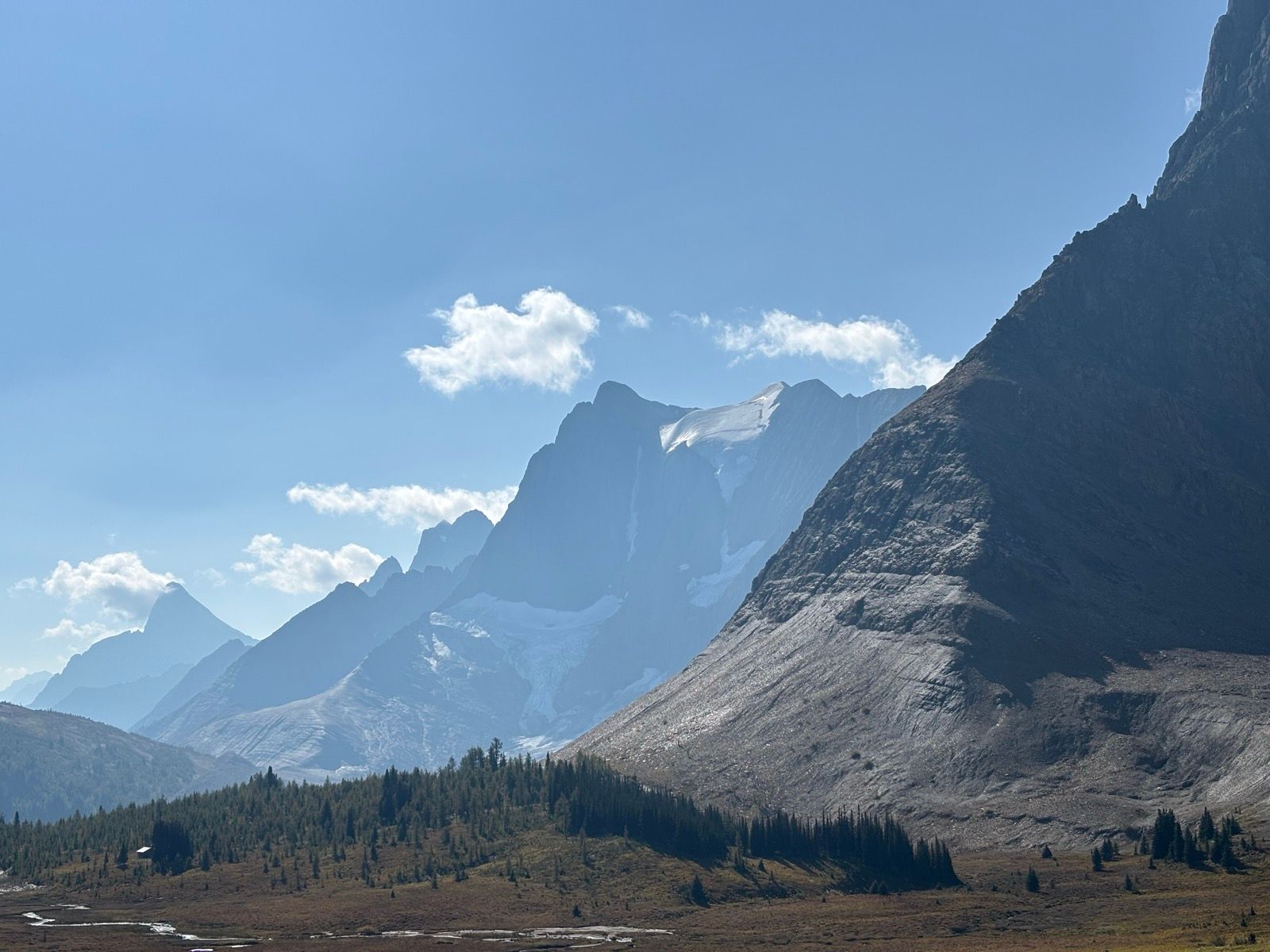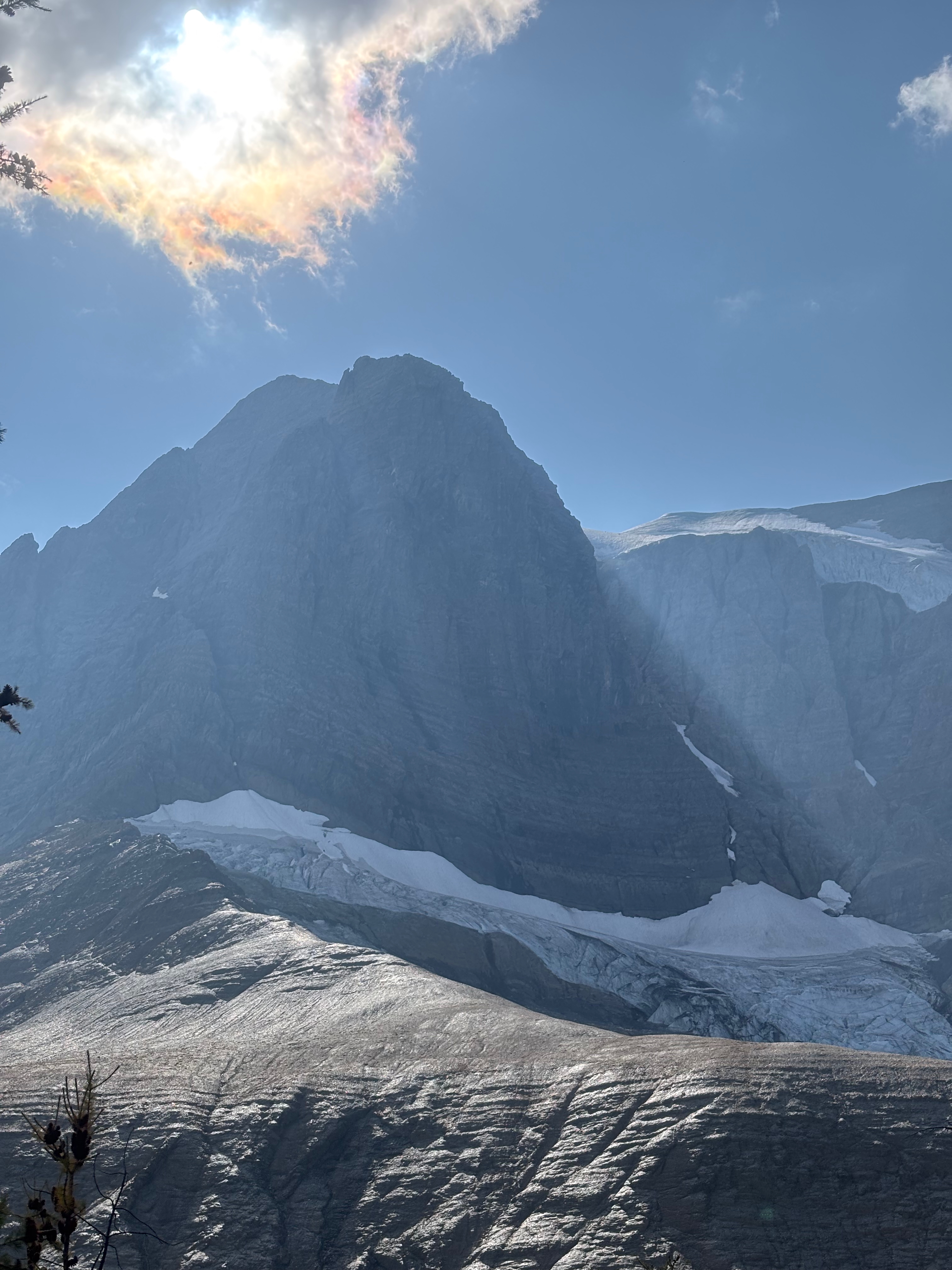 The view was amazing and the trail just keeps getting better as the mountains on the west side keep changing as you progress along the trail. Most hikers seem to stop at Tumbling Creek Campground, but we powered on across Tumbling pass and onto Numa Creek. Tumbling Pass gives you views of amazing glaciers and more steep mountains.