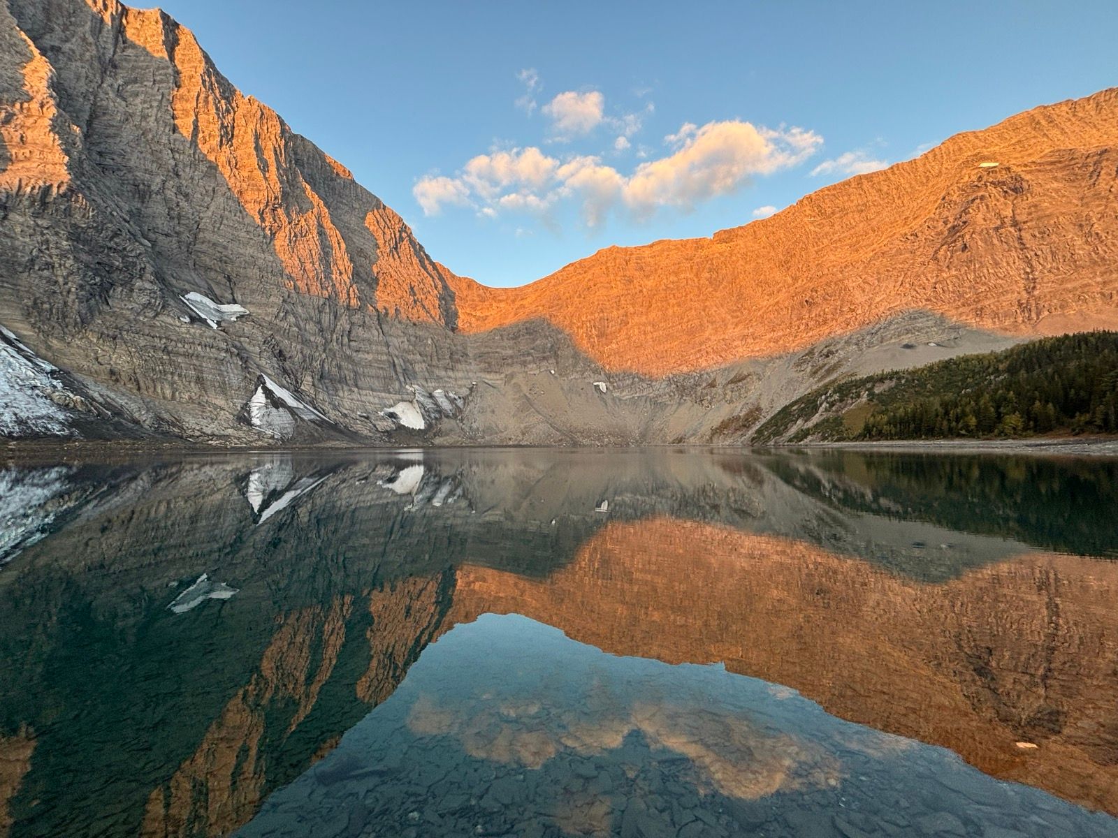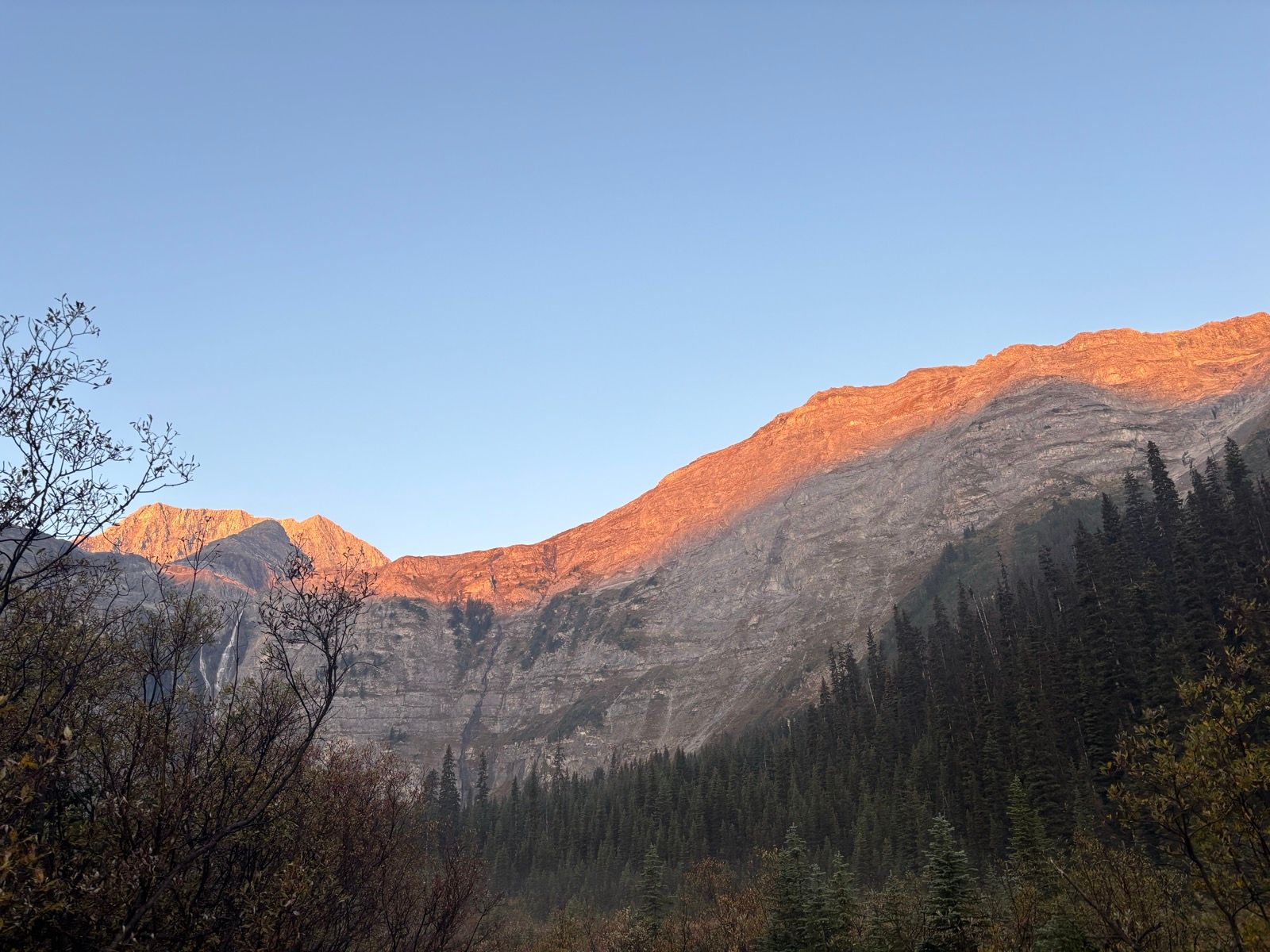 Sunrise on Floe Lake was just spectacular in the morning, just stunning. The sun came up from the west, peeked over the mountain and for about 15 minutes cast an amazing orange glow across Floe mountain. A campsite with a great sunrise makes me so happy.